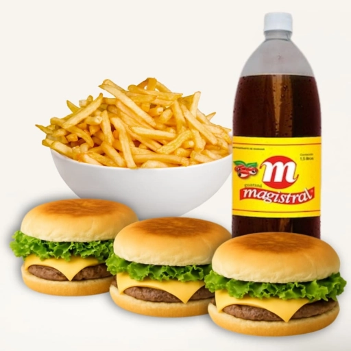 3 X-salada + Batata P + Pet 1,5L (regente ou magistral)